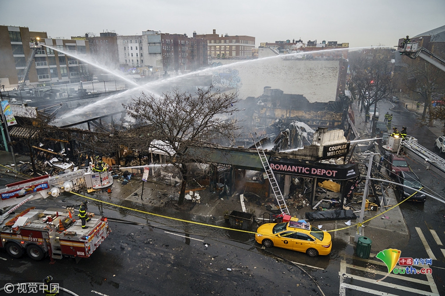 當地時間2018年12月13日,美國紐約,在紐約皇后區(qū)皇后大道,一場大火吞噬了六家商鋪,消防隊員正在努力撲滅火災余燼。十幾人受傷,包括6名消防員。起火原因仍在調查中。圖片作者:Drew Angerer