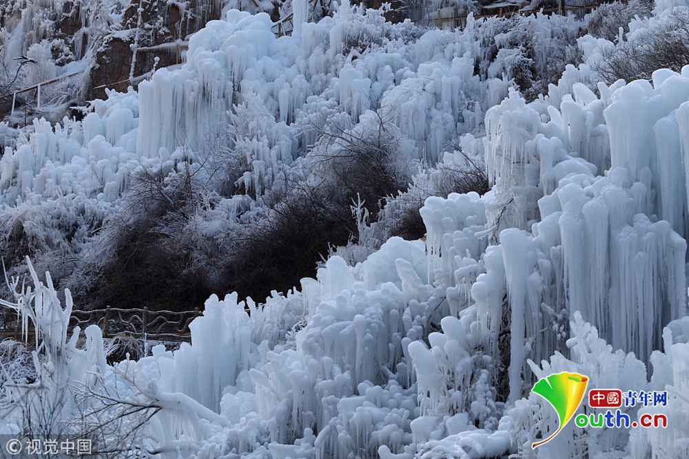 炭廠村神泉峽景區(qū)大面積人工冰瀑形成美麗的冰瀑景觀,預(yù)計(jì)12月19日正式向游客開放。
