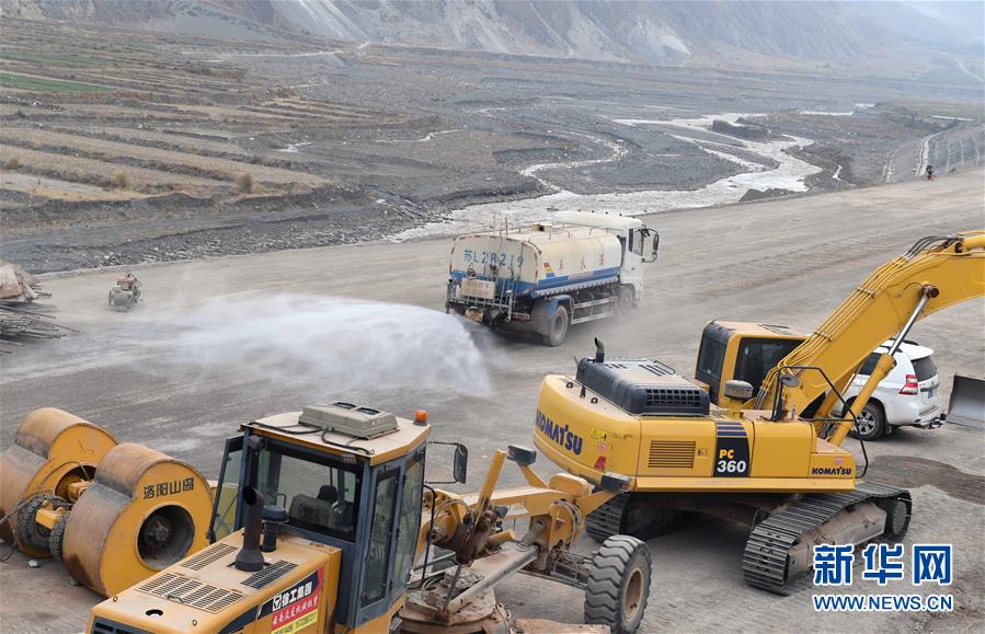 12月15日,一輛灑水車(chē)在中鐵上海局集團(tuán)公司施工的東格高速公路土建項(xiàng)目工地進(jìn)行灑水降塵作業(yè)。新華社記者楊宗友攝