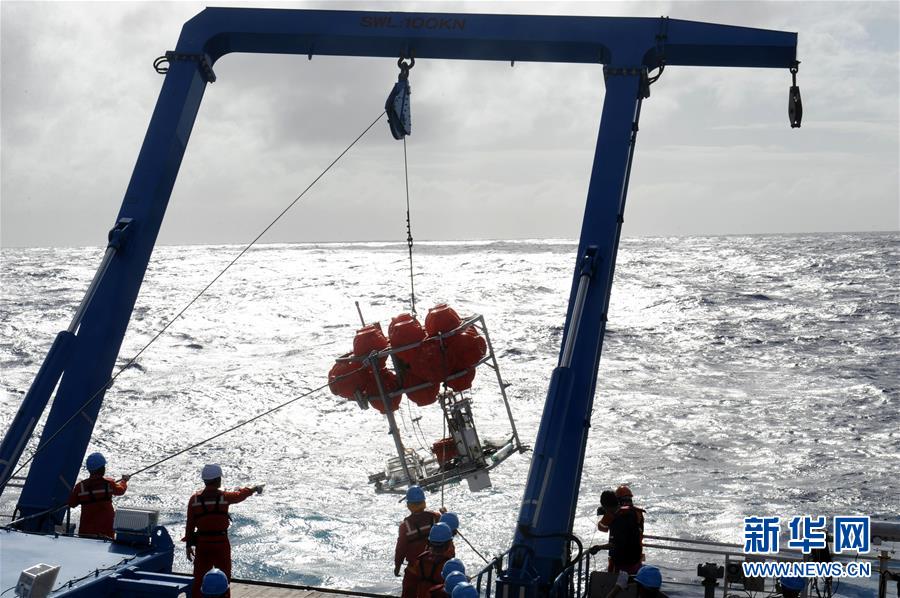 考察隊(duì)員在“沈括”號(hào)上回收“彩虹魚”著陸器(12月16日攝)。