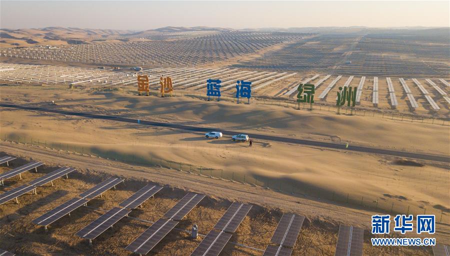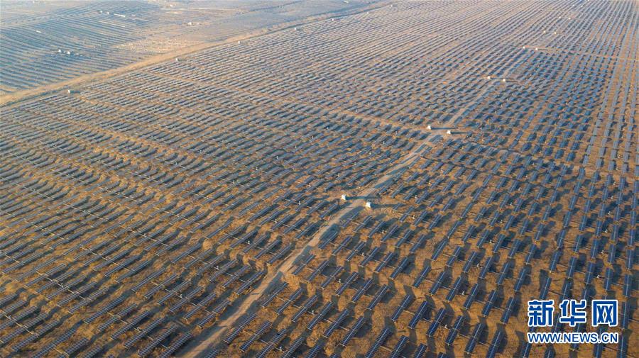 位于庫布其沙漠腹地的達拉特光伏發(fā)電應(yīng)用領(lǐng)跑基地一期500兆瓦項目(12月13日攝)。