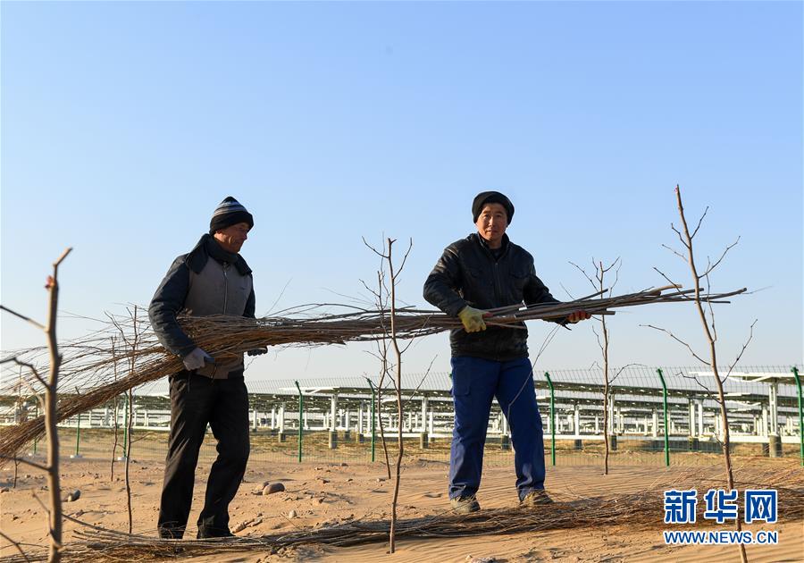12月13日,位于庫(kù)布其沙漠腹地的達(dá)拉特光伏發(fā)電應(yīng)用領(lǐng)跑基地一期500兆瓦項(xiàng)目中,工人用柳枝制作固沙帶。 新華社記者 彭源攝