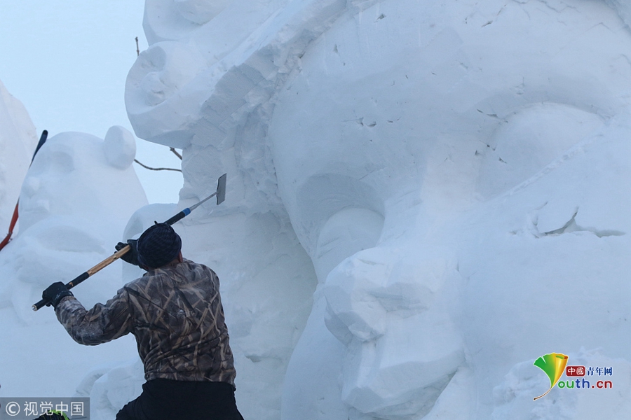 2018年12月13日,黑龍江省哈爾濱市,國內(nèi)最大的雪雕盛會太陽島雪博會正在緊鑼密鼓建設(shè)中,部分雪雕雛形已現(xiàn),雪雕師正在精雕細(xì)刻打磨中。