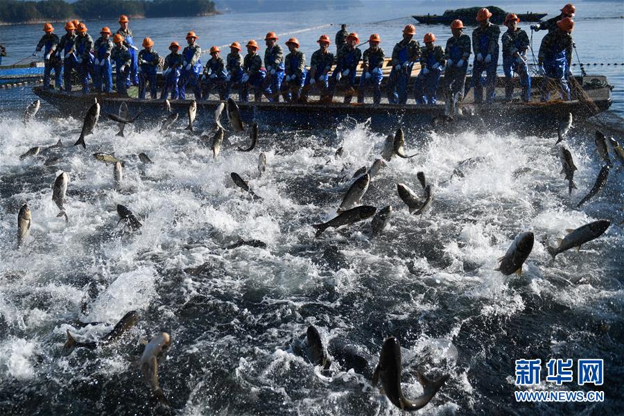 11月28日,捕撈隊員在千島湖進行巨網(wǎng)捕魚,群魚躍出水面。