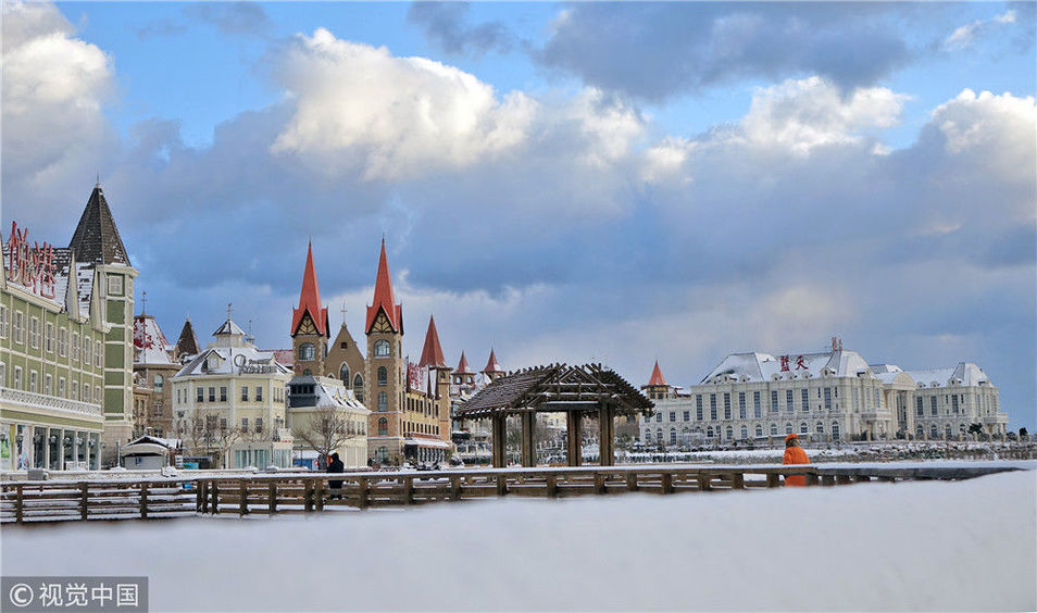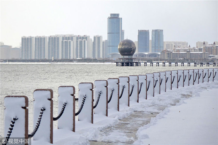 2018年12月7日,山東煙臺(tái),雪后的海濱景色。當(dāng)日煙臺(tái)迎來今冬首場(chǎng)降雪,海濱建筑在大雪的裝點(diǎn)下,形成海濱城市獨(dú)有的美麗雪景。地處膠東半島的煙臺(tái),冬季降雪量遠(yuǎn)高于地理位置相近的其他地區(qū),形成了獨(dú)特的海濱雪城,是中國(guó)著名的“雪窩”。唐克/視覺中國(guó)