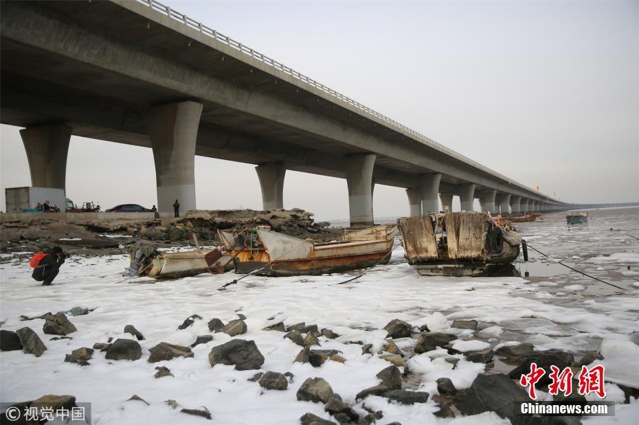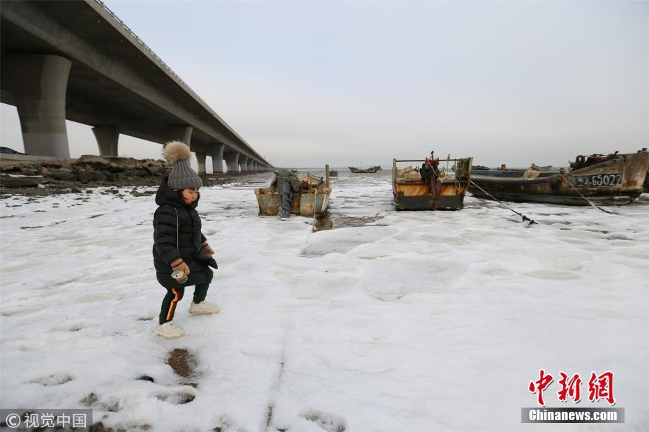 12月9日,受大風(fēng)降溫天氣影響,青島膠州灣北部冰情初現(xiàn),青島西海岸新區(qū)膠州灣跨海大橋入口處海冰層層疊疊,暫未對(duì)海上漁業(yè)生產(chǎn)帶來影響。張進(jìn)剛 攝 圖片來源:視覺中國(guó)