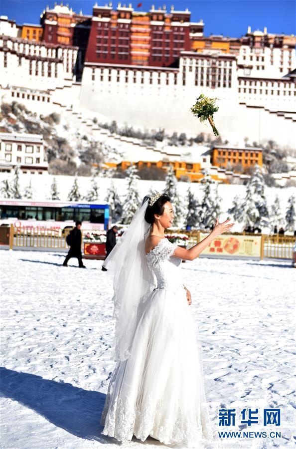12月19日,一名女士在布達(dá)拉宮廣場(chǎng)上拍婚紗照。 12月18日,西藏拉薩市迎來今年入冬以來的首場(chǎng)降雪。19日清晨,拉薩雪后初霽,處處銀裝素裹,盡顯雪域高原之美。 新華社記者覺果攝
