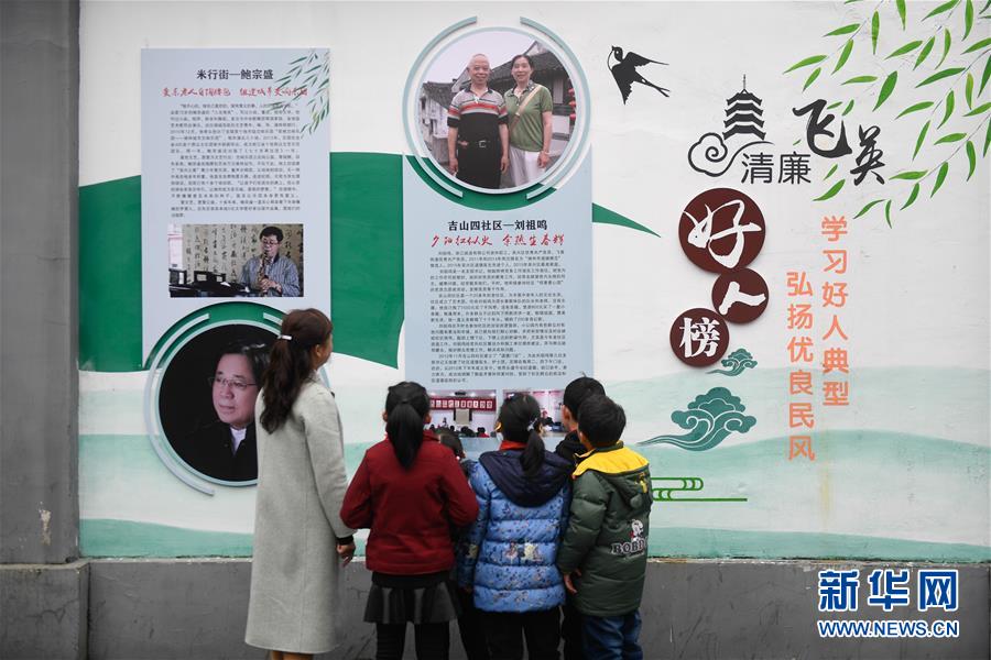 12月19日,小學生在湖州市吳興區(qū)飛英街道眠佛寺街觀看好人榜的事跡介紹。 新華社記者黃宗治攝