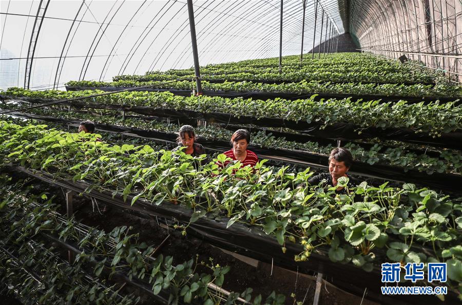 12月19日,農(nóng)戶(hù)在大棚里管理草莓。 2017年5月,遼寧省鐵嶺市昌圖縣大四家子鎮(zhèn)方家船口村利用土地確權(quán)成果,由村兩委班子成員領(lǐng)辦創(chuàng)辦了昌圖久晟果木蔬菜種植專(zhuān)業(yè)合作社。到2018年9月,合作社利用產(chǎn)業(yè)扶貧資金、壯大村集體經(jīng)濟(jì)扶持資金、村集體用地和村民入股資金建成了11個(gè)“股份制大棚”,主要種植草莓等作物,產(chǎn)品通過(guò)電商銷(xiāo)往云南、四川、北京、上海等地,預(yù)計(jì)第一期可為265名貧困戶(hù)每人分紅860元。 新華社記者潘昱龍攝