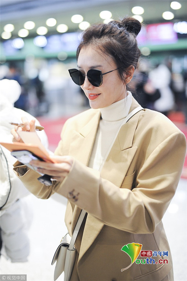 2018年12月11日,上海,秦嵐現(xiàn)身機(jī)場。她穿淺西裝配高領(lǐng)毛衣溫暖又時尚,梳丸子頭清新減齡,機(jī)場獲粉絲送告白信,嬌羞嘟嘴賣萌少女范十足。