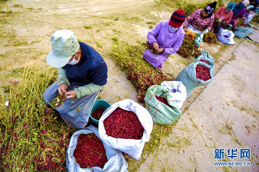 11月18日,在衡水市冀州區(qū)周村鎮(zhèn)辣椒加工交易基地,椒農(nóng)在摘辣椒。