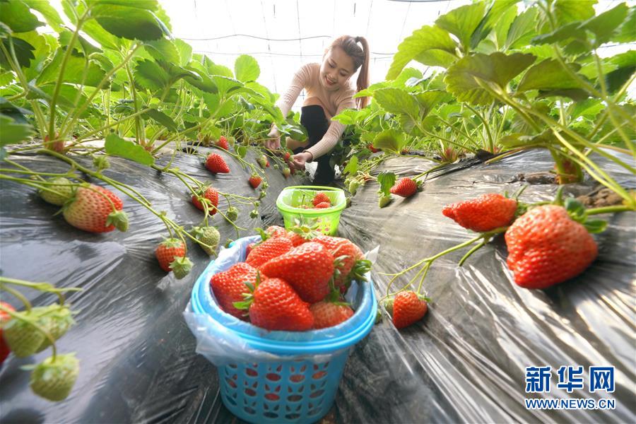 12月20日,游客在唐山市豐潤(rùn)區(qū)眾浩草莓種植專業(yè)合作社大棚內(nèi)采摘草莓。 新華社記者 牟宇攝