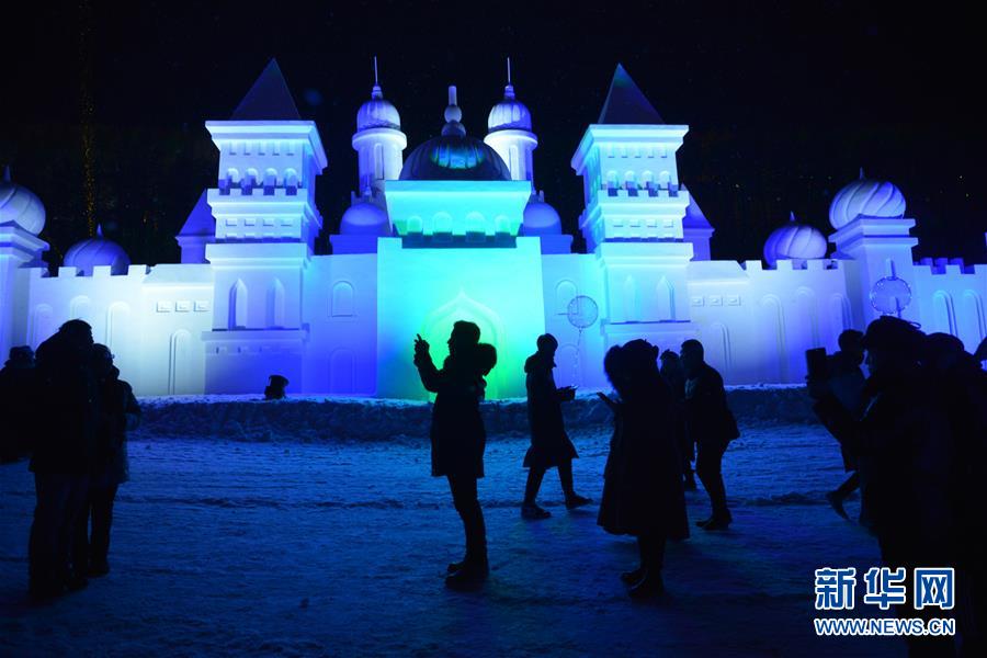 12月21日,游客在冰雪節(jié)開幕式上參觀雪雕城堡。新華社記者鄒予攝