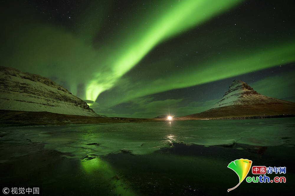 冰島西海岸高463米的Kirkjufell山上空出現(xiàn)極光,呈現(xiàn)出湖泊山峰極光交相輝的景觀。
