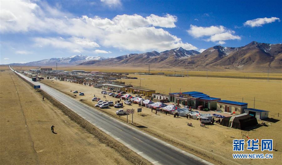 這是在青藏公路旁搭建的那曲縣香茂鄉(xiāng)畜產(chǎn)品展銷會(huì)(2017年11月25日無(wú)人機(jī)拍攝)。 新華社記者 劉東君 攝