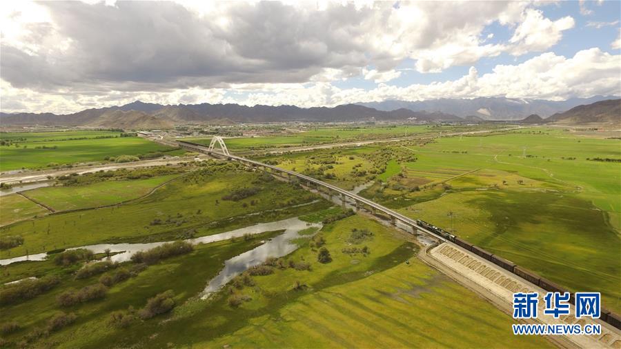 列車在青藏鐵路延長線拉日鐵路上行駛(2016年6月17日無人機(jī)拍攝)。 新華社記者 劉東君 攝