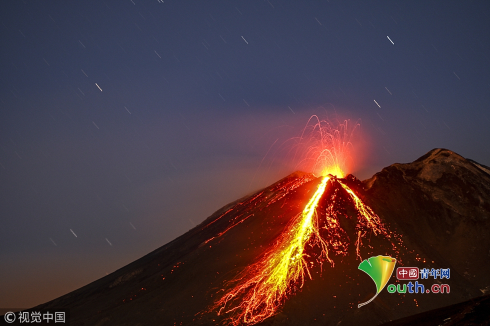 意大利埃特納火山噴發(fā) 大量巖漿照亮火山口