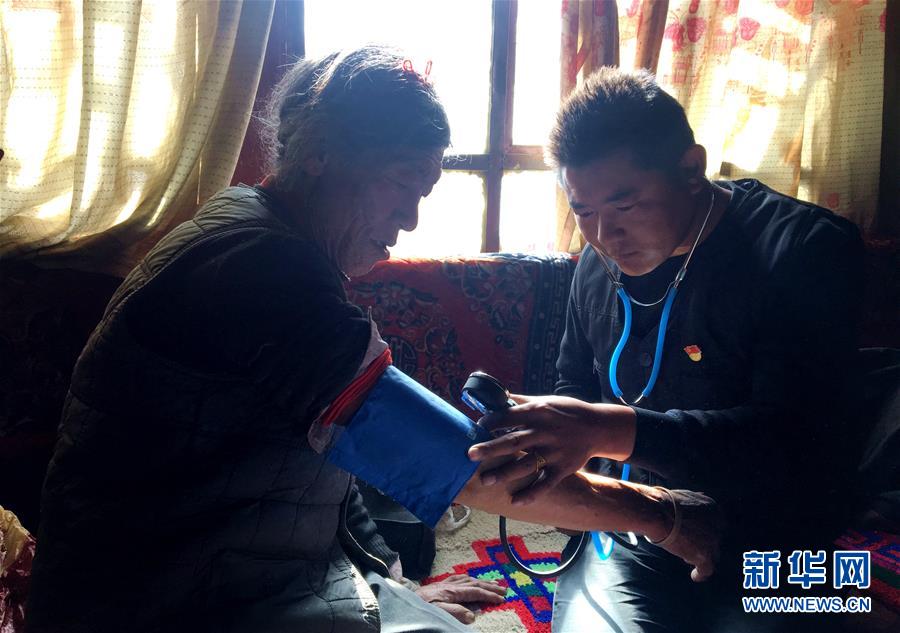 楚魯松杰鄉(xiāng)衛(wèi)生院院長次仁頓珠(右)在給楚魯松杰鄉(xiāng)巴卡村卡熱組阿孜冬季牧場的牧民索朗多吉測量血壓(12月22日攝)。 新華社記者 陳尚才 攝
