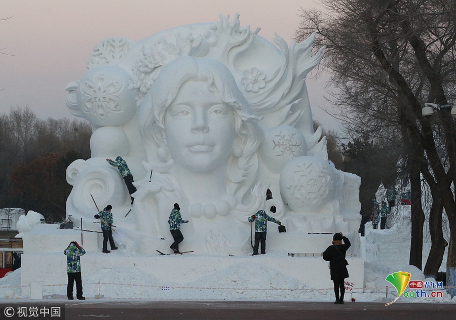 探秘哈爾濱太陽(yáng)島雪博會(huì):雪雕師精雕細(xì)刻建造忙