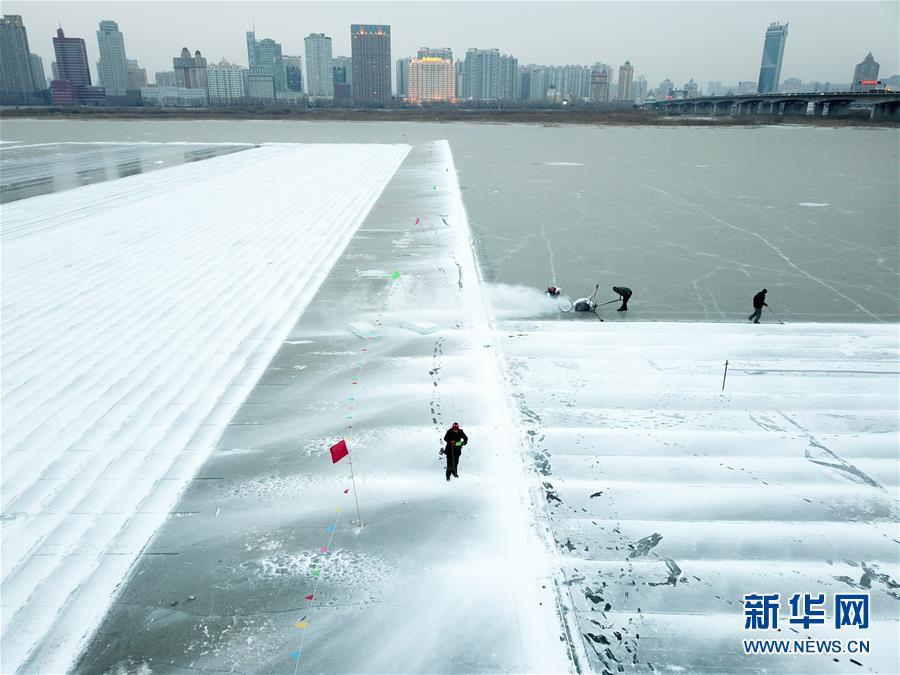 在松花江哈爾濱段江面,工人們在進行切割和采冰工作(12月12日無人機拍攝)。 黑龍江哈爾濱市的冰雪主題樂園哈爾濱冰雪大世界的采冰和建設(shè)工作近日拉開帷幕。為保證足夠的優(yōu)質(zhì)冰供給,每天有近千名采冰人和700多輛運冰車參與到采冰工作。 新華社記者 王松 攝
