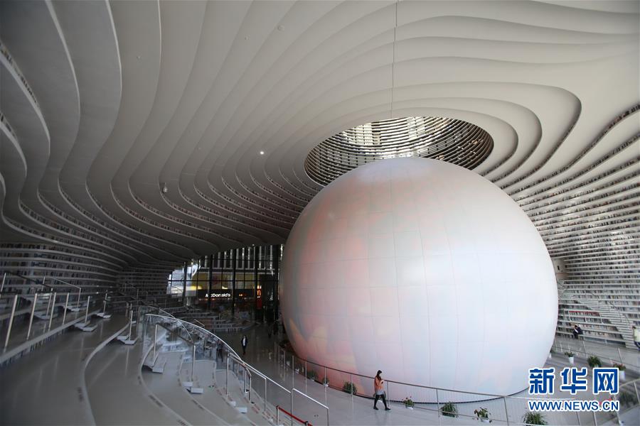 這是12月27日拍攝的天津?yàn)I海新區(qū)圖書(shū)館中庭。 濱海新區(qū)圖書(shū)館位于天津?yàn)I海文化中心,2017年10月1日正式開(kāi)館,設(shè)計(jì)立意為“濱海之眼”和“書(shū)山有路勤為徑”。圖書(shū)館現(xiàn)有藏書(shū)60多萬(wàn)冊(cè),一年多來(lái)接待讀者約280萬(wàn)人次,已成為濱海新區(qū)的文化“新地標(biāo)”。 新華社記者安希雅攝