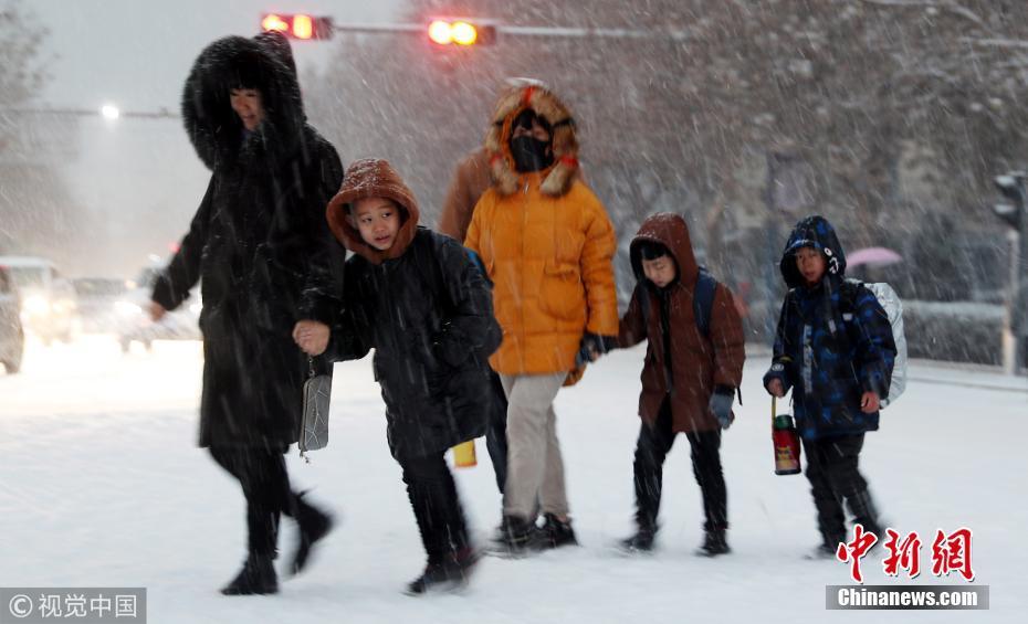 河北石家莊井陘縣縣城,人們在雪中出行。受多股冷空氣的持續(xù)影響石家莊出現(xiàn)降雪、降溫天氣。圖片來源:視覺中國