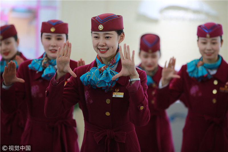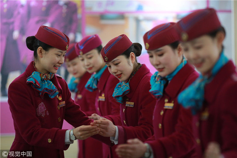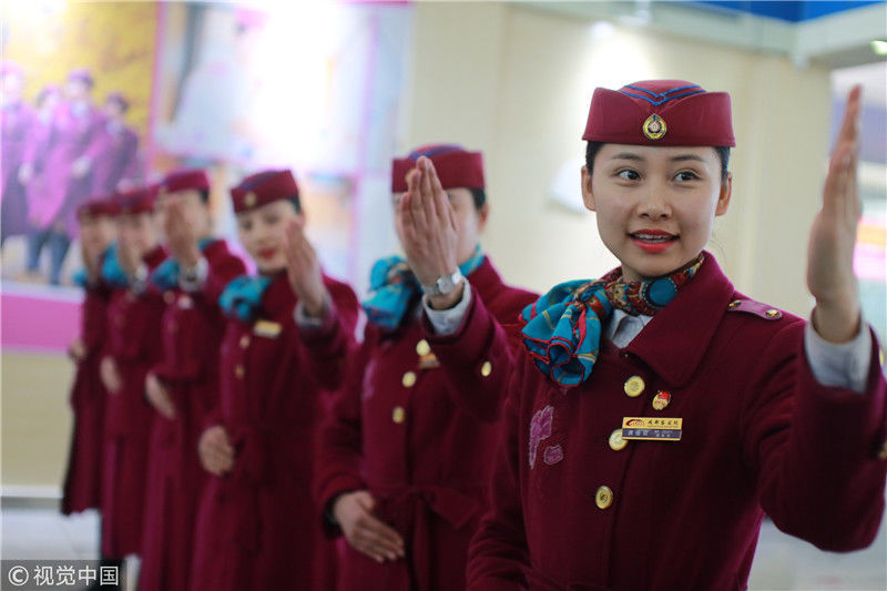2018年12月27日,四川成都,為備戰(zhàn)即將開通的成雅鐵路,中國鐵路成都局集團(tuán)有限公司成都客運(yùn)段動(dòng)車二隊(duì)對成雅動(dòng)車的乘務(wù)人員進(jìn)行理論、形體、服務(wù)禮儀等內(nèi)容的培訓(xùn)。蘇志剛/視覺中國