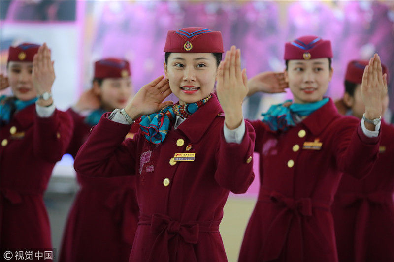 2018年12月27日,四川成都,為備戰(zhàn)即將開(kāi)通的成雅鐵路,中國(guó)鐵路成都局集團(tuán)有限公司成都客運(yùn)段動(dòng)車二隊(duì)對(duì)成雅動(dòng)車的乘務(wù)人員進(jìn)行理論、形體、服務(wù)禮儀等內(nèi)容的培訓(xùn)。