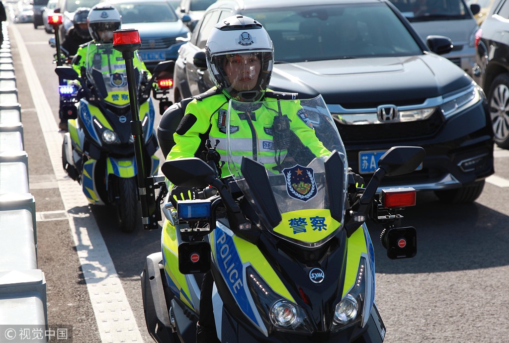 “江北新區(qū)分局交警支隊(duì)大橋特勤隊(duì)”的騎警隊(duì)員身著靚麗的熒光綠制服,騎行在南京長江大橋上巡邏。