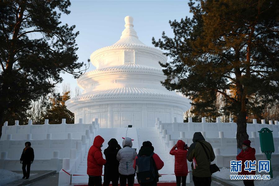 12月29日,在太陽島雪博會園區(qū),游客在雪雕作品前拍照。 當日,第31屆哈爾濱太陽島國際雪雕藝術(shù)博覽會正式開園。本屆太陽島雪博會以“歡樂雪博會·夢幻雪域游”為主題,占地90萬平方米,分為五大景區(qū)。 新華社記者 王建威 攝