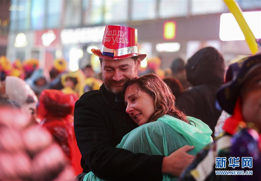 1月1日,在美國紐約時(shí)報(bào)廣場,人們在雨中參加跨年活動(dòng)。 新華社記者秦朗攝