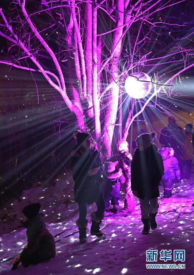 2018年12月31日,在芬蘭南部城市埃斯波,人們在燈光點(diǎn)綴的公園內(nèi)玩耍。