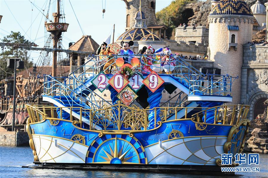 1月1日,在日本東京迪士尼樂園,扮成迪士尼卡通形象的演員們在游船上向游客致意。 新華社記者杜瀟逸攝