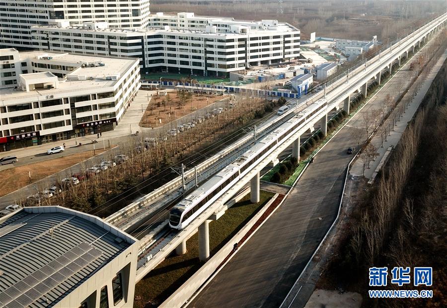 這是2018年12月29日無(wú)人機(jī)拍攝的車輛通過(guò)濟(jì)南軌道交通1號(hào)線創(chuàng)新谷站。新華社記者朱崢攝