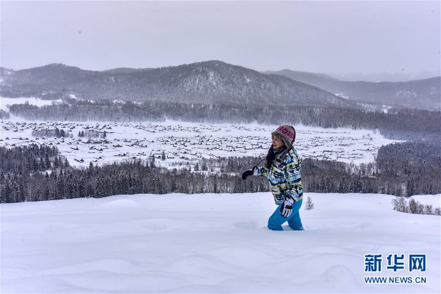 1月1日,在新疆禾木雪鄉(xiāng),一名游客體驗(yàn)積雪厚度。