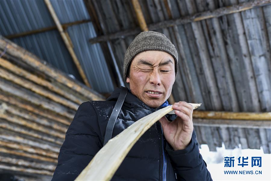 在新疆布爾津縣禾木村的一處冬季牧場,森格爾在制作毛皮滑雪板時將牛皮繩系于滑雪板上(1月3日攝)。 新華社記者 胡虎虎 攝