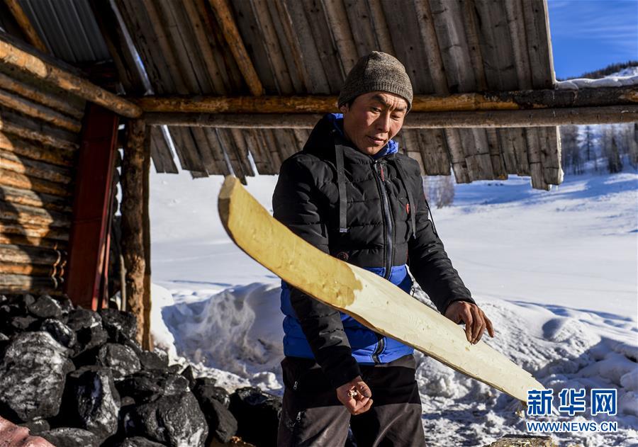 森格爾在新疆布爾津縣禾木村的一處冬季牧場制作毛皮滑雪板(1月3日攝)。新華社記者 胡虎虎 攝