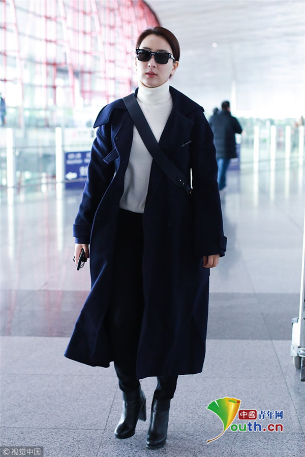 2019年1月7日,北京,馬蘇現(xiàn)身機(jī)場(chǎng)。她身穿黑色到腳大衣霸氣外露,架黑超涂紅唇似帥氣“女特工”。