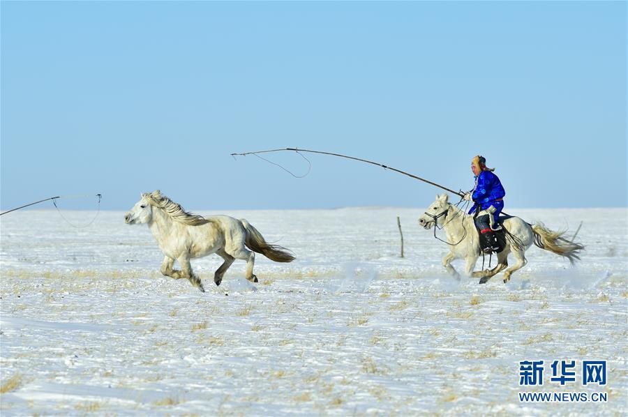 1月8日,牧民進(jìn)行套馬表演。 時(shí)下正值草原冬季旅游旺季,內(nèi)蒙古自治區(qū)西烏珠穆沁旗的牧民們在雪原上一展身手,為游客展現(xiàn)獨(dú)特的民族風(fēng)情。 新華社記者 鄒予 攝