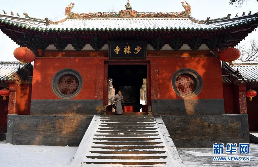 1月10日,一位僧人在少林寺內(nèi)清掃積雪。當日,雪后初霽,河南登封少林寺分外秀美。 新華社記者 李嘉南 攝