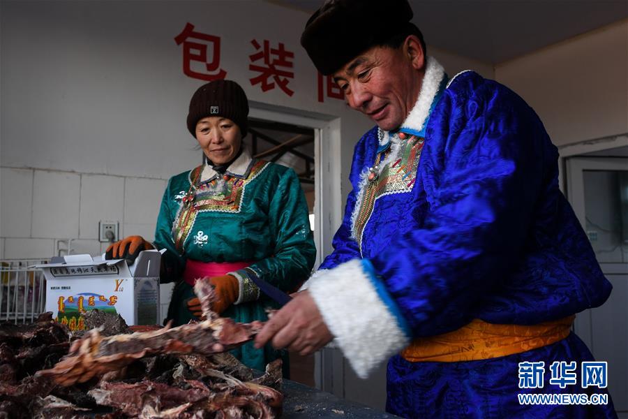 1月9日,牧民伊拉代(右)和妻子斯琴高娃在包裝風干好的牛肉。 新華社記者 劉磊 攝