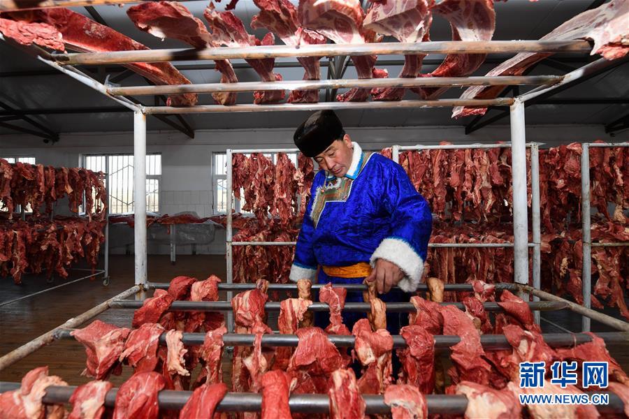 1月9日,牧民伊拉代在查看風干牛肉。 新華社記者 劉磊 攝