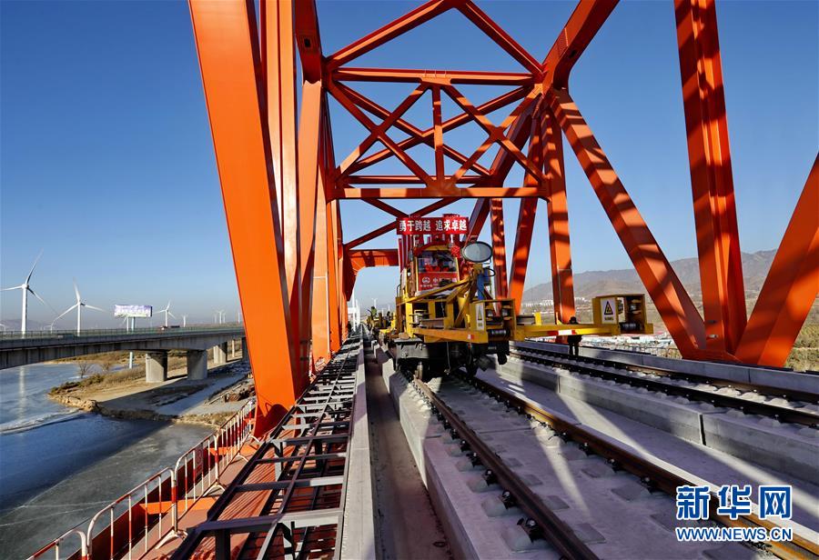 1月13日,中鐵三局的工人在京張高鐵官?gòu)d水庫特大橋進(jìn)行鋪軌作業(yè)。 新華社記者 楊世堯 攝
