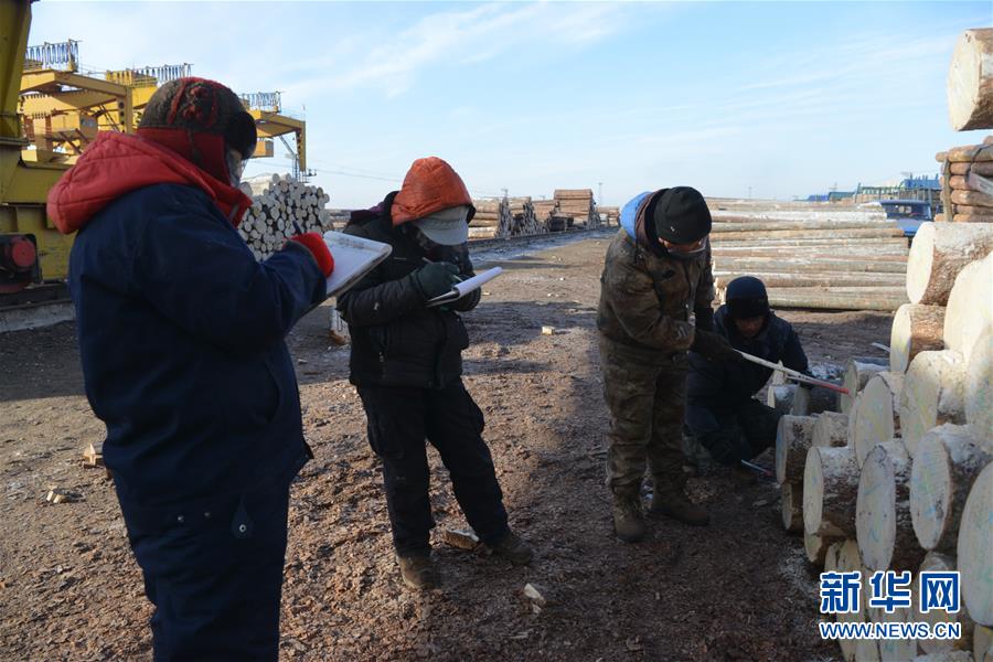 1月12日,在滿洲里鐵路口岸站裝卸二車間原木換裝場區(qū),工作人員對進(jìn)口落地原木進(jìn)行檢尺核對工作。