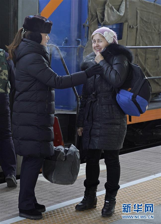 1月11日,在滿洲里火車(chē)站站臺(tái),“金鑰匙”服務(wù)臺(tái)客運(yùn)員協(xié)助外籍旅客乘車(chē)。