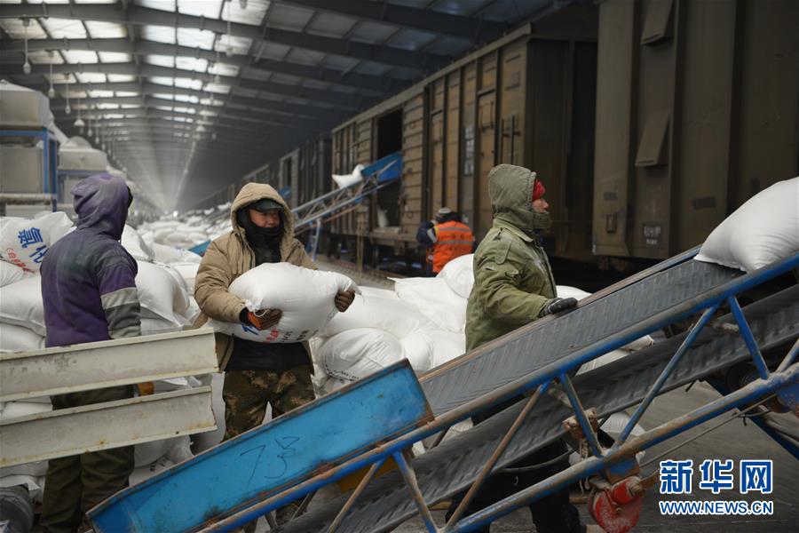 1月12日,在滿洲里鐵路口岸站裝卸二車(chē)間化肥作業(yè)場(chǎng)區(qū),工作人員將化肥放上傳送帶。 新華社記者 鄒予 攝