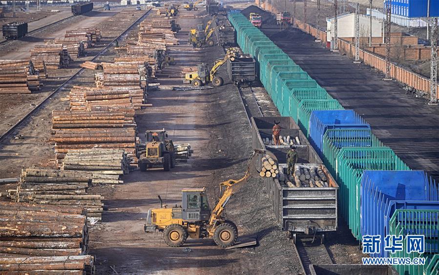 1月12日,在滿洲里鐵路口岸站裝卸二車(chē)間原木換裝場(chǎng)區(qū),工作人員進(jìn)行原木裝車(chē)作業(yè)。 新華社記者 才揚(yáng) 攝
