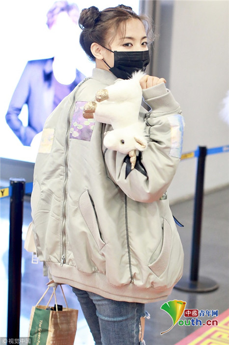 2019年1月14日,北京,楊超越現(xiàn)身機(jī)場。她扎哪吒頭活力十足,甩玩偶淘氣回眸,穿破洞褲露美腿,披面包服似自帶鼓風(fēng)機(jī)。