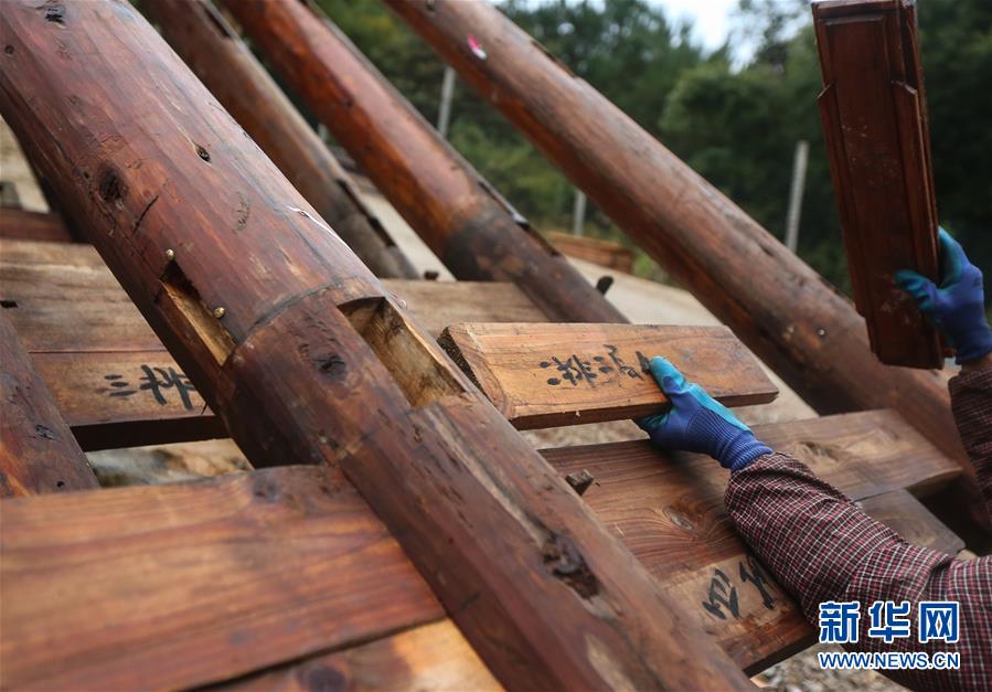 1月15日,在廣西融水苗族自治縣融水鎮(zhèn)夢(mèng)嗚苗寨,一名工人將苗族吊腳樓的主要結(jié)構(gòu)進(jìn)行“復(fù)原”安裝。新華社記者 陳君清 攝
