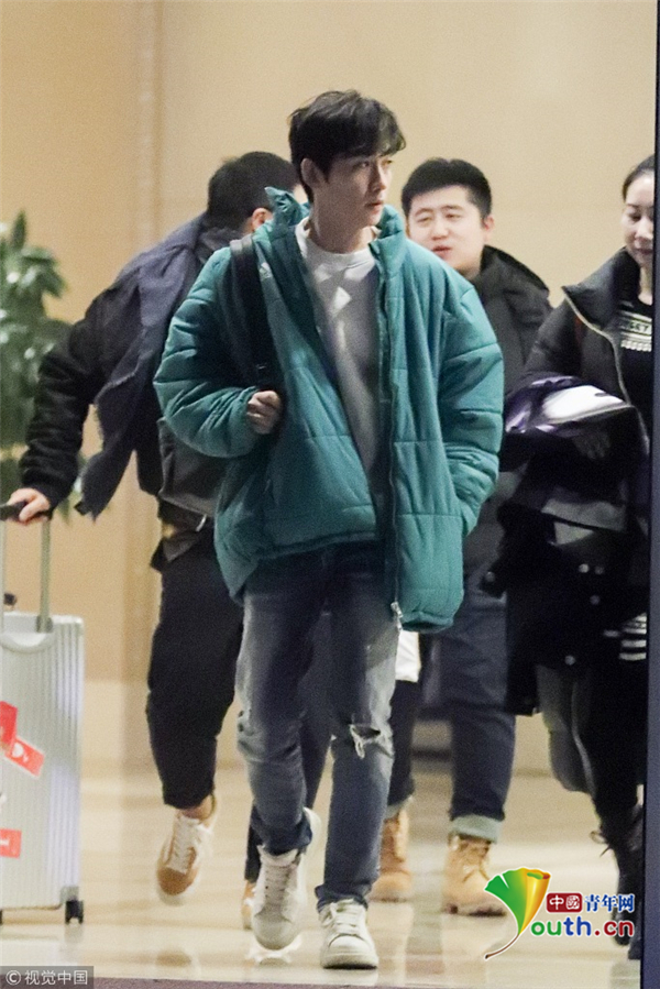 1月15日,北京,朱一龍現(xiàn)身機場。他穿綠色棉襖一路插兜保暖,搭配破洞褲潮范兒十足長腿搶鏡,打扮簡單毫無男神包袱,看鏡頭還一臉呆萌,但氣質仍然出眾。